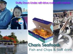 1 to 1.5 hours special tour, Onboard Captain with tuition and morning / afternoon tea (Coffee, Tea & Lamington cake) and Charis Seafood - Lunch pack (Fish and Chips + Soft drink)