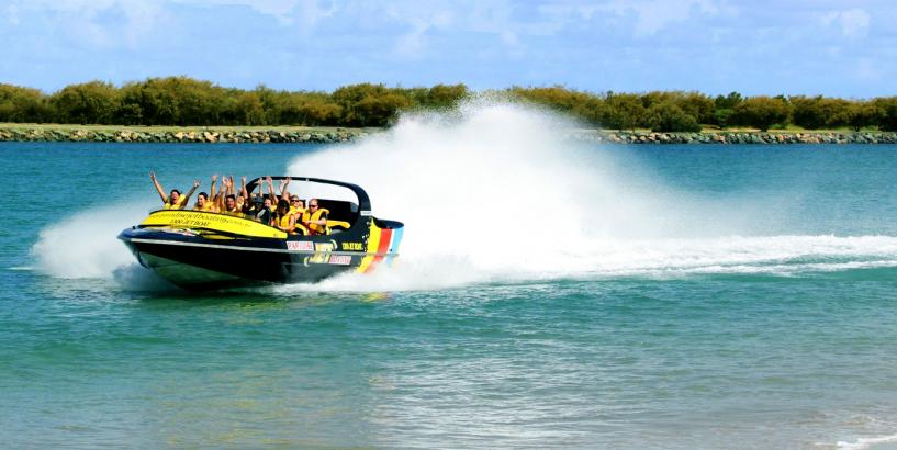 Departing directly into the Broadwater and missing the slow 6 knot areas allows us to give much longer rides, more ‘Full-On’ 360 degree spins, high speed drifting and other exciting Jet Boat manoeuvres sometimes in as little as 10 cm of water..…and provides the best value jet boating experience in Australia.